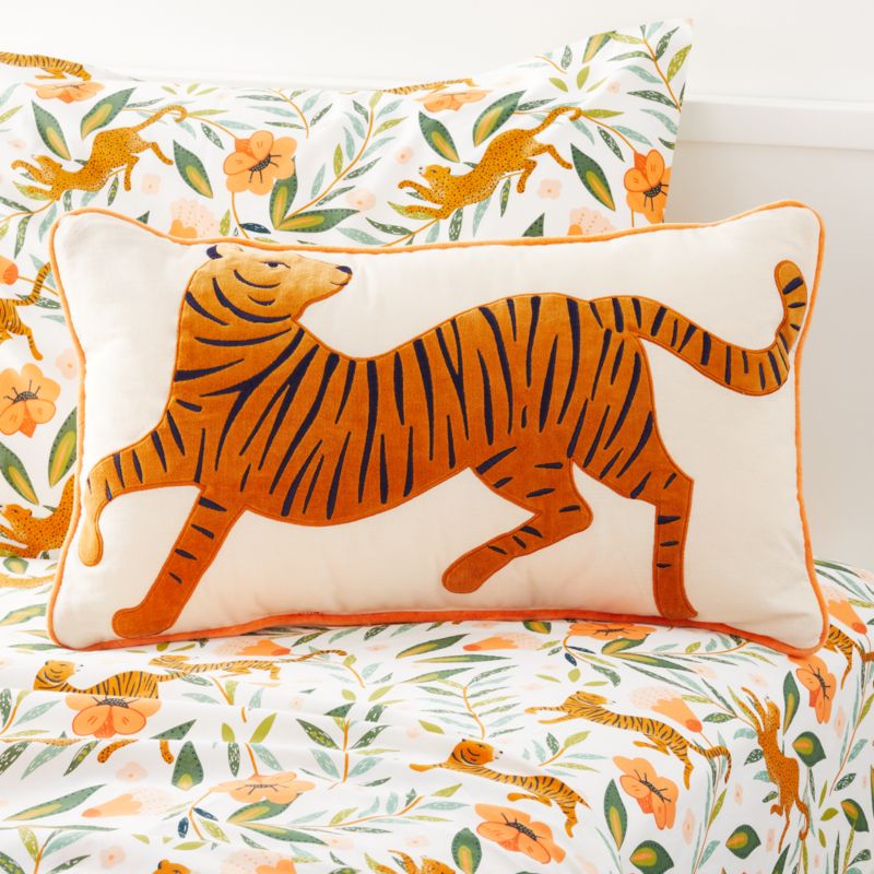 A tiger stalks gracefully across our Tiger Pillow, pausing to pose against the peachy pink background. Highlighted with embroidery, the feline pillow is perfect for young adventurers. The pure cotton throw pillow pairs perfectly with our Marrakech Tiger bedding or adds a dose of wild beauty tossed on playroom furniture.