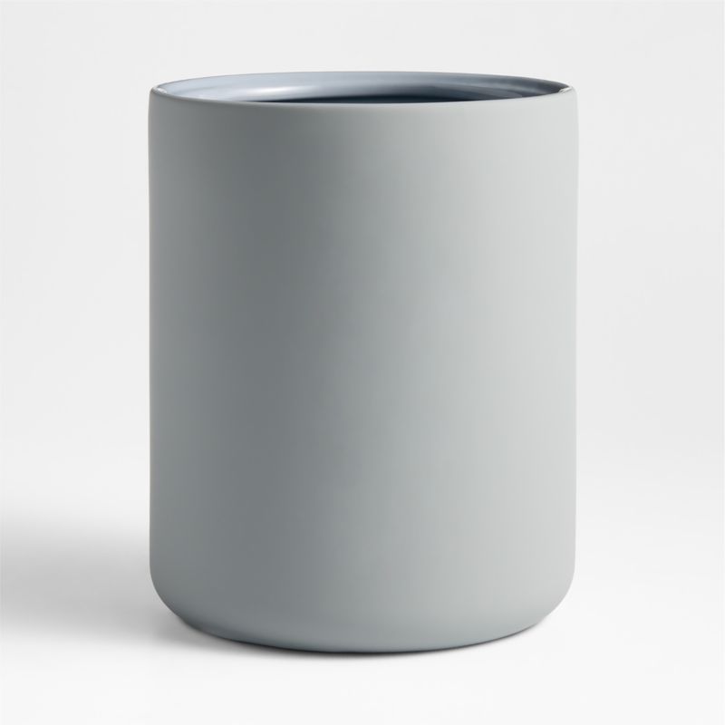 Our Varick bathroom collection dips sturdy ceramic in soft-touch silicone that feels soft and luxurious. The gentle, minimalist curves and compact scale suit even the smallest powder room, guest bath or en suite. Subtly tinted in a modern shade of light grey-blue, this tonal trash can pairs a matte exterior with a glossy interior finish. Outfit bathrooms in all of our Varick accessories to create serene sanctuaries that are ready for company.