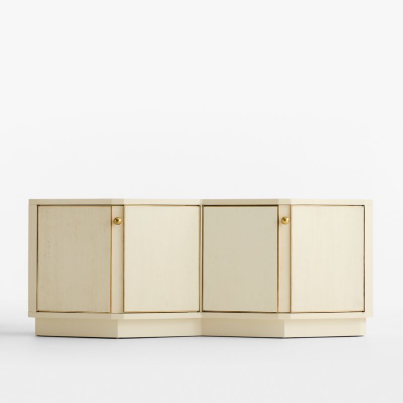 From top to plinth base, Vesper's faceted facade brings Art Deco flair to a 1970s-inspired design. The wood console gleams with a high-gloss cream lacquer finish. Tonal grasscloth covers the doors for soft contrast, accented with polished brass trim and oversized pulls. Divided at the center with a fixed partition, the angled double-panel doors open like a vintage jewelry box to reveal generous storage space with one adjustable shelf in each cabinet.
