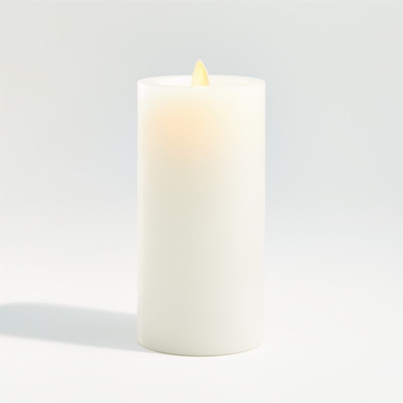 Our flameless candle fools the eye with its lifelike flickering, warm glow and charming faux flame dancing atop a real wax pillar. Safe and mess-free, the white candle creates atmosphere and gentle illumination on the nightstand, next to the bathtub or anywhere a burning candle would be impractical. Use the remote control (sold separately) to turn the pillar on, or set the timer for five automatic hours of delightful and worry-free candlelight every evening.