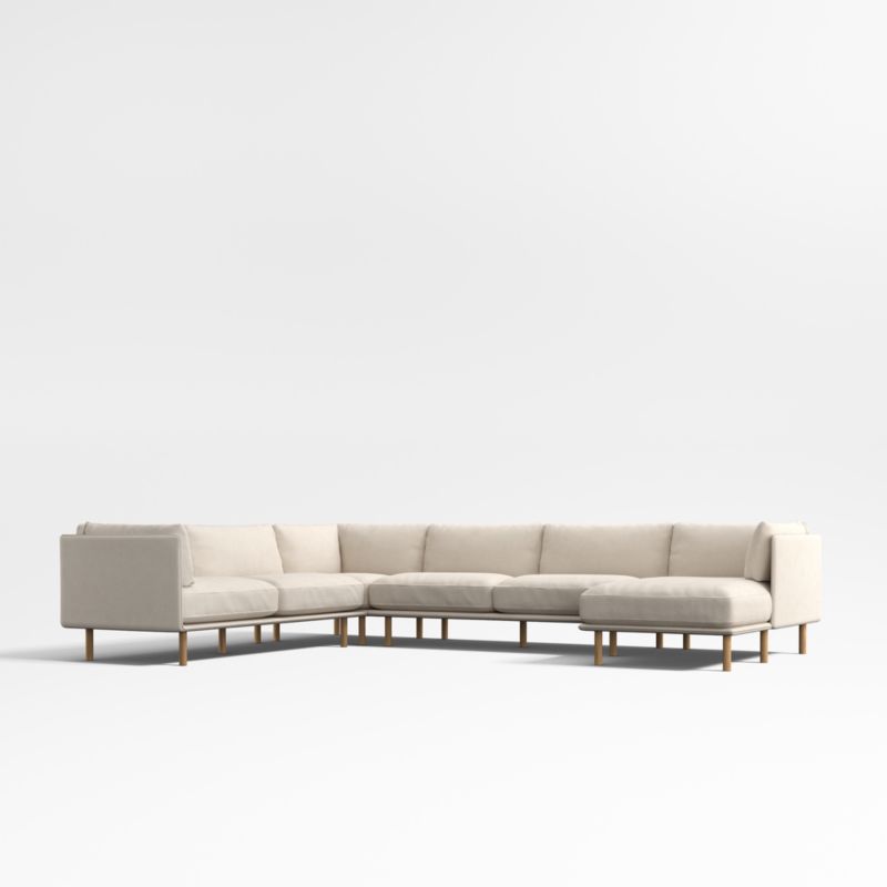Modern, sophisticated and undeniably inviting, our Wells U-shaped sectional tucks plump cushions onto a slim frame supported by sustainably sourced solid wood legs with a natural finish. Low decks allow plenty of room for indulgent seat cushions that encourage you to linger. Tailored with top stitching and French seams on the cushions and a crisp micro-flange outlining the frames, the soft twill fabric suits active family life and cleans up beautifully. Joining a left-arm sofa, corner, armless sofa and right-arm chaise, our Wells four-piece sectional is a Crate & Barrel exclusive.
