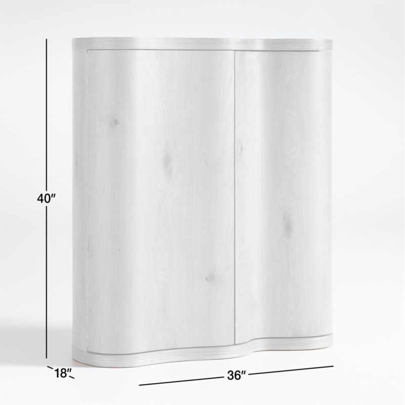 Our Winslow bar cabinet brings playful warmth and organic curves to living rooms. Made of solid oak and oak veneer, the cabinet celebrates the wood's naturally occurring knots and varied grain with its contemporary asymmetrical design and undulating curves. And the surprises don't end there. Two concealed doors push open to reveal an olive green interior and loads of storage space, including two pivot drawers and seven shelves shaped to follow the bar's sculptural curves.
