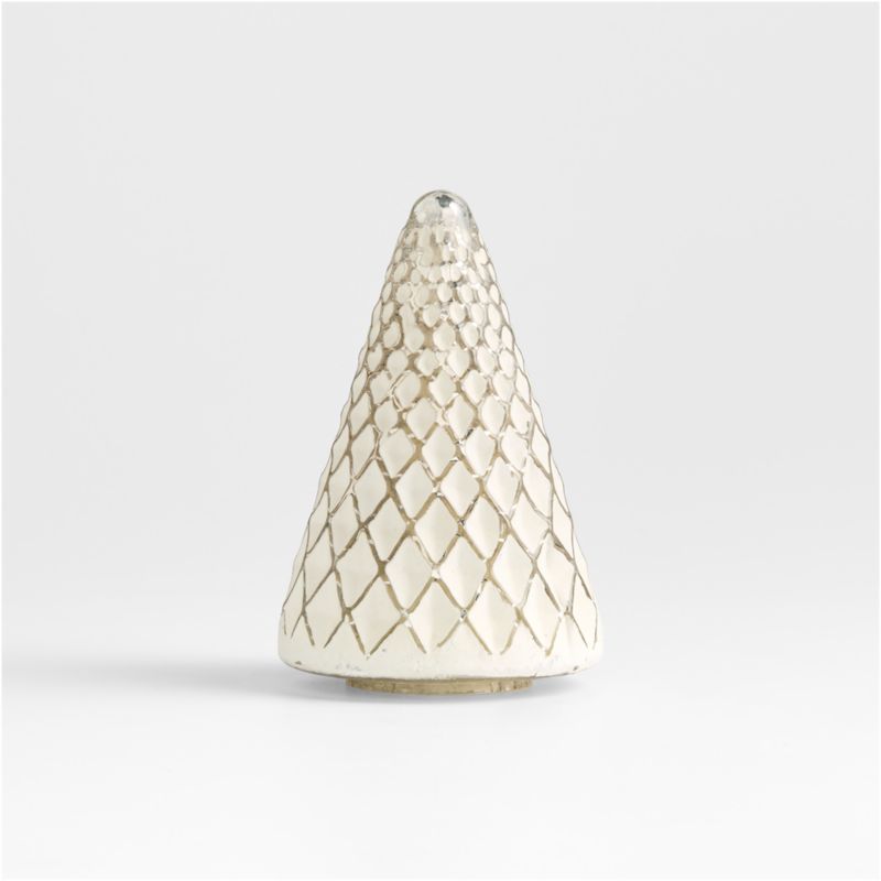 Create a wintry wonderland on your mantel, buffet or dining room table with our glass tree collection. A matte winter-white coating on the interior brings the fluted contrast and molded lattice pattern of the antique silver mercury glass into wintery contrast. We love the subtle way the extra-small tree shines in the glow of candles and string lights.