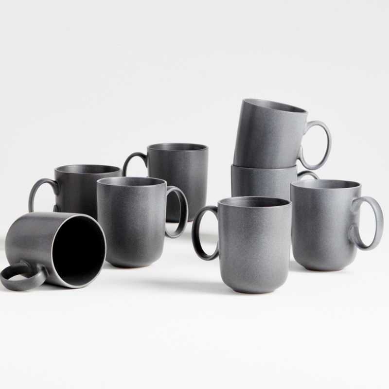The subtle speckles of a reactive glaze animate the clean coupe shapes of our set of grey Wren mugs. Finished in tonal charcoal, the eight coffee cups set a modern table with their confident curves and organic beauty. For a coordinated look, add the matching bowls and plates. Each stoneware piece will have its own distinctive look due to the reactive nature of the glaze.