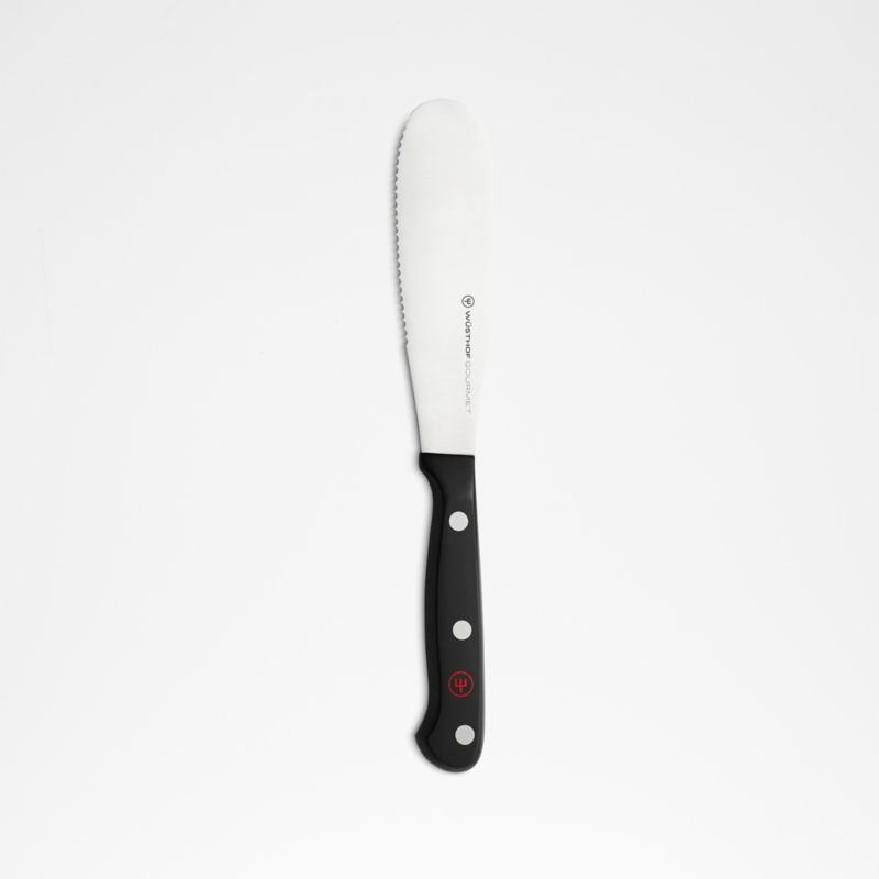 Spread butter, jam, mayonnaise and soft cheeses with ease using this versatile spreader. Part of Wüsthof's Gourmet collection, the knife is an essential addition to your cutlery set. The high-carbon stainless steel tool smoothly spreads toppings and cuts breads, produce and harder cheeses, thanks to its partially serrated blade.