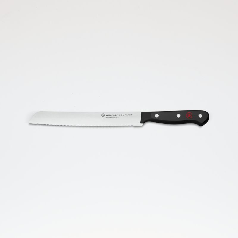 Add to your cutlery collection with this bread knife. Laser-cut, non-forged blade is tempered and hardened steel with a long-lasting, V-ground edge with a serrated edge for cutting bread, tomatoes, pineapple and other ingredients with a tough outer layer. Wustof bread knives have a flat tip that helps you cut through the crusty bottom of a loaf of bread. Once the blade cuts through to the bottom of the loaf, tilt the blade forward toward the tip and drag the knife along the board to finish the last strip of crust.